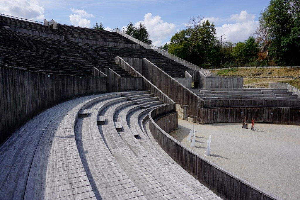 La construction de cet édifice commença à la fin du Ier siècle avant l’ère commune, pour permettre à 17 000 spectateurs de prendre place sur trois rangées de gradins. Ses dimensions, de 148 m sur 65 m et 25 m de hauteur fait de cet amphithéâtre l’un des plus grands du monde romain. Il accueillait à l’époque de nombreux spectacles, destinés à des combats de gladiateurs, d’animaux sauvages ou encore des chasses. Les nombreux pèlerins et les habitants de la cité se divertissaient lors des fêtes en l’honneur d’Apollon Grannos, le guérisseur, dans la mythologie celtique. Les plus aisés comme les notables, s’installaient au premier rang, pour pouvoir profiter du combat au plus proche de l’adrénaline. Chaque spectateur pouvait alors croiser les animaux en cage, lors de leur passage dans le corridor pour atteindre les gradins.